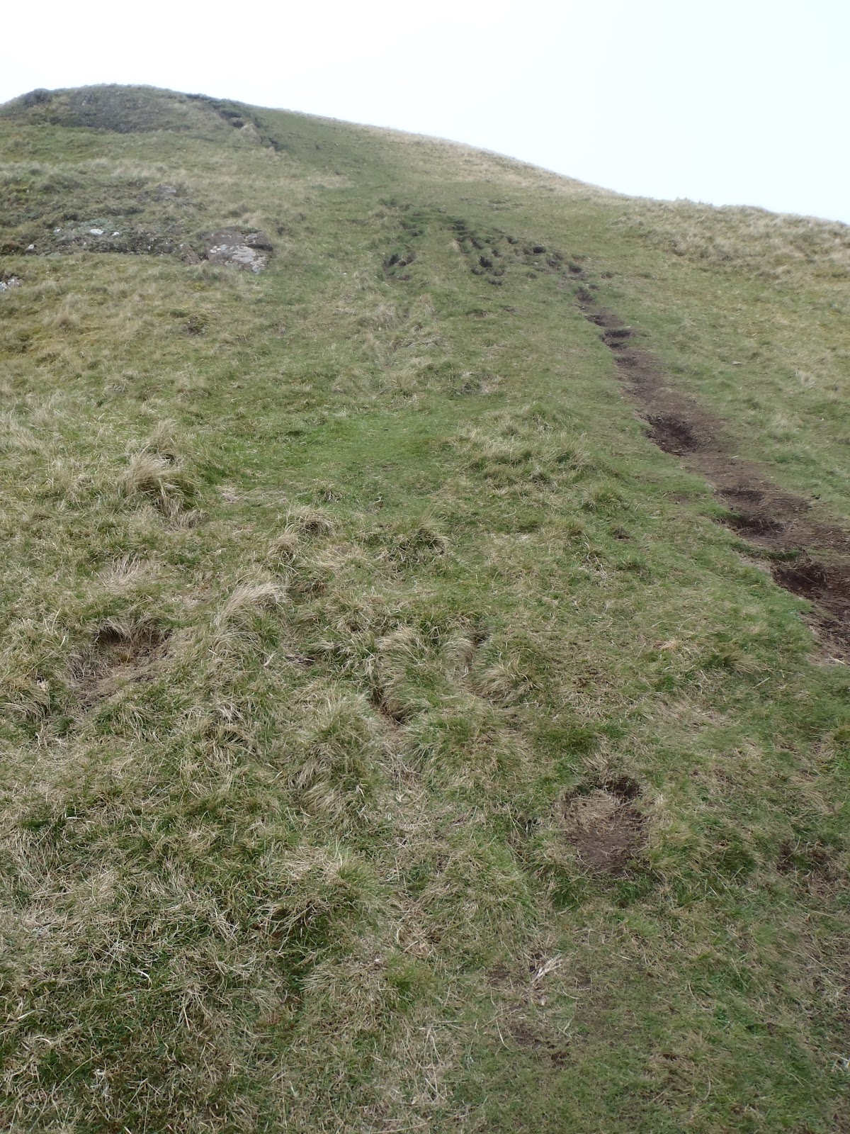 Over the stile and up a gentle incline, through a sheep padock. After the next double stile it goes straight up at a very steep angle. From the bottom it looks brutal. It is!