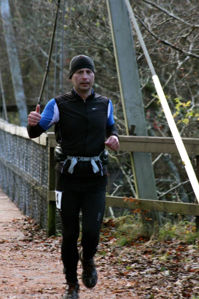 It was bloody freezing! But at least it stayed dry. I had barely noticed we had started from talking to Andy. From the new start to the bridge from where last years got underway was mostly uphill and very quickly had us all puffin' and pantin'. I had no idea how long this extra bit took me as my watch had failed to start, so i ended up running 'naked' today.